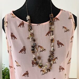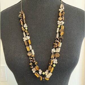 Two strand necklace with beads that look like brown tiger's eye beads, clear and pale green beads, and various shapes including discs and cylinders for a lot of visual interest. This is a quality piece with knotting between each bead and two clusters of beads at the back with one cluster that hangs down. Total length of necklace is approximately 28". Necklace slips over the head. No brand or material tag.