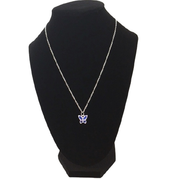 π Pretty silver plate chain pendant/necklace, featuring simulated September birthstone sapphire in a butterfly design
