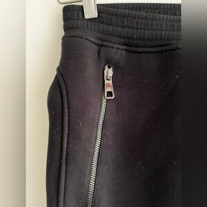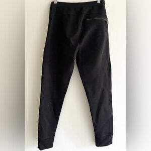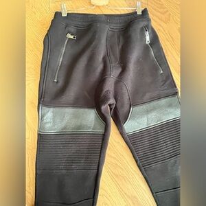 Biker style jogging trousers in viscose blend featuring two front zipped pockets, faux leather inserts, elasticated cuffs and waistband. Low rise.