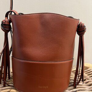 Musca leather bucket bag from NEOUS featuring cognac brown, calf leather, panelled design, gold-tone logo lettering, contrast stitching, tassel detail, single twisted top handle, adjustable detachable shoulder strap, open top and main compartment.