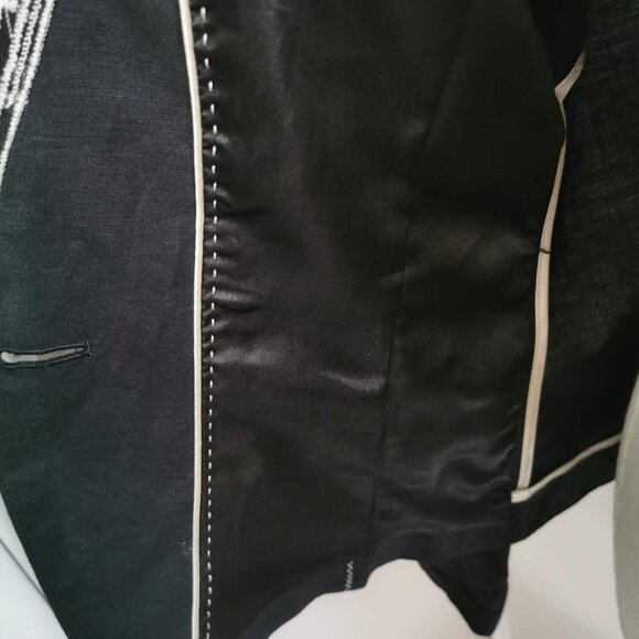 This is a stylish, size 36 Ness blazer. It's a black linen-blend jacket with light taupe contrast stitching, featuring detailed accents on the lapel and pockets. Versatile for both casual and formal wear, it pairs well with jeans or dresses. This piece is a must-have for any wardrobe, offering both style and versatility.