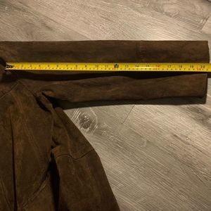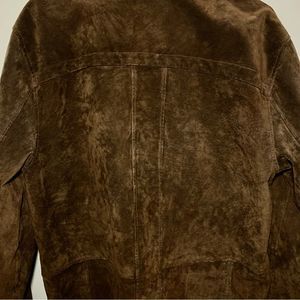 100% Suede Leather Jacket from Nevada. Polyester lining. Collared with 2 deep front pockets. Panelled detailing. Zipper enclosure with snap buttons. In excellent preworn condition with minimal signs of wear. No rips, holes or stains. Size M Men’s, but would be a great oversized piece for women as well. The tag has size 38-40 marked (which would depend on preferred fit), but please pay attention to listed measurements.