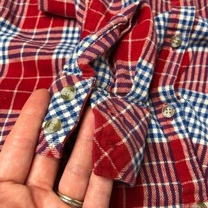 Nevada red, white and navy blue plaid flannel long sleeve shirt with buttons up/down the front, two buttoned pockets and a hood. It also has a scooped/curved edges hem. Super cute with a pair of black leggings or a pair of distressed denim. The sleeves can be rolled up and cuffed for a more relaxed casual look. In excellent used condition with no flaws. Please see photos for measurements. Women’s size MEDIUM.