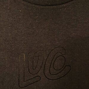 PRINT ON FRONT: LuCo logo in black (black print on charcoal fabric, very stealthy)