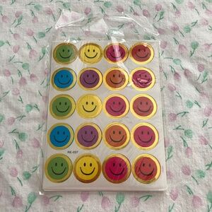 Includes 10 sheets of round circle smiley face stickers in green, blue, yellow, magenta pink, purple, red and orange.