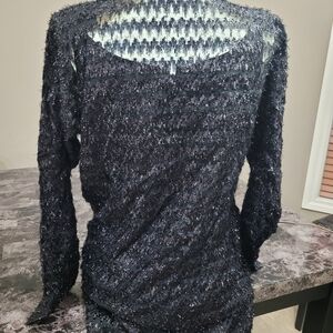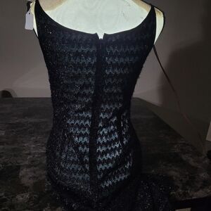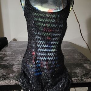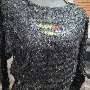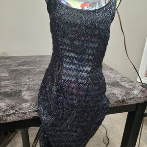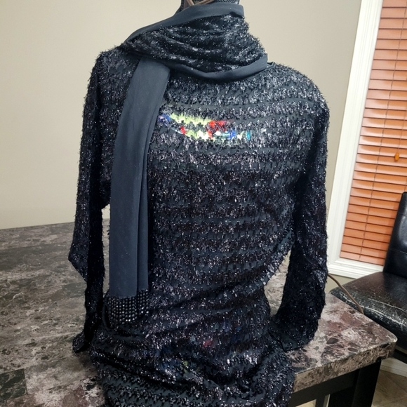 This has a sheer outer layer and a black slip linner. Skirt is just above the knee. You can wear with or without shirt and scarf. Tag is missing, it wad purchased at the Bay and never worn.