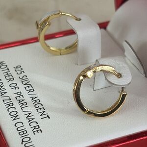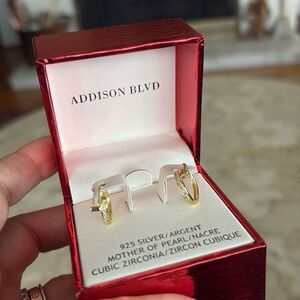 Lovely brand new earrings from Addison Blvd, 925 Sterling Silver with mother of pearl and cubic zirconia. Beautiful bypass style hoops.