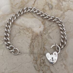 NEW! 925 Sterling Silver Heavy Curb Link Heart Padlock Bracelet 8” - 40g