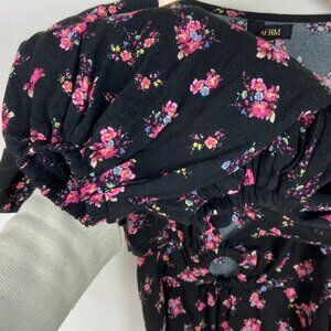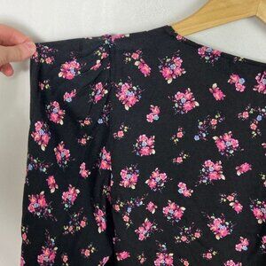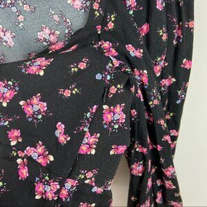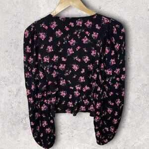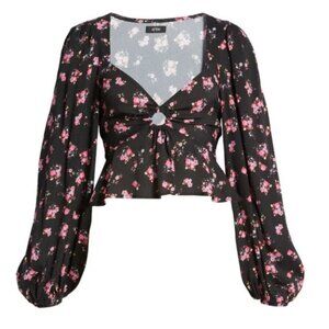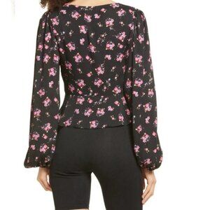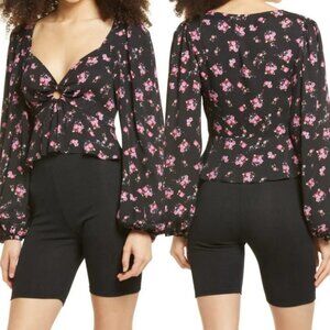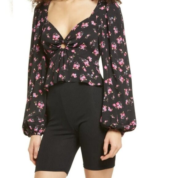 Hart Floral Print Peplum Top In Noir Blush Floral by AFRM from Nordstrom. Women's size XS. Retails for $78 USD (approximately $109 CAD). Modern charm defines this floral-print blouse styled with a playful front cutout and gracefully billowed sleeves. True to size, XS = 2 to 4.