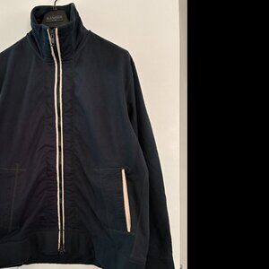 NEW. Never worn/washed. Jacket and pants athletic suit. Sz L. Navy Blue colour. 67% Polyester/33% Cotton - heavy weight material. Jacket 2-way front zipper; 2 side pockets. Back upper has open webbed flap. Reflectors on back. Jacket measurements Chest = 51 in. length from collar = 29 in. Sleeve length from armpit = 22 in. Pants breakaway on side style from waist to cuff on outside of both legs. 2 front zip pockets. Drawstring waist. Reflectors on pant cuffs. Jersey stretch waistband. Measurements Waist = 38-40 in; Inner seam length = 32 in. Price is for both pieces as a set.