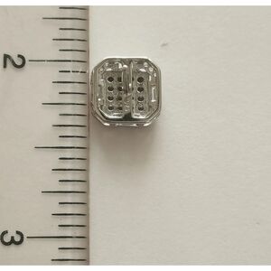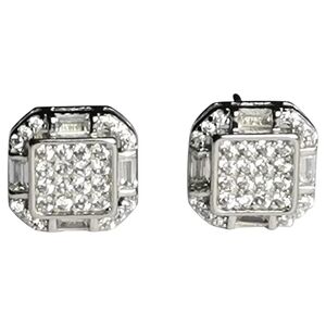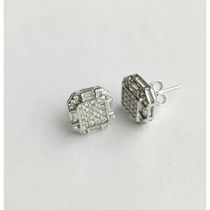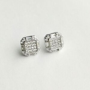 An elegant pair of stud earrings, in geometric design. The square setting is emphasized by the baguettes on all the sides. Pave set central surface.