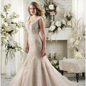 This gown is brand new, with tags, but has been tried on a few times, and worn for a photo shoot for our bridal show. It is in very good sample condition, with nothing glaring to note at the time of this listing. Possibly a few loose beads or threads, nothing to note at this time.