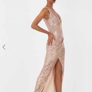Sparkling evening gown crafted from allover sequins. Topped with a plunging V-neck. Constructed in a faux tulip wrap-style with a high-low hem that creates a natural slit.