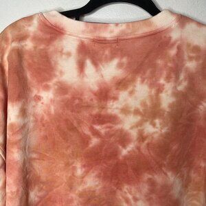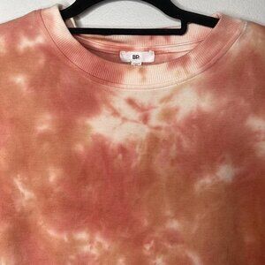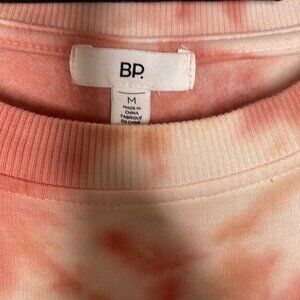 This BP sweatshirt features an orange and tan tie dye print, long sleeves, a pullover style, kangaroo middle pocket, and crew neck.