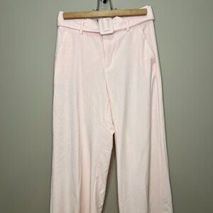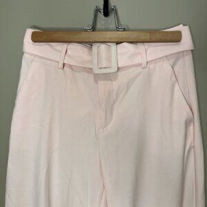 These stylish light pink trousers feature a high waist, cropped length, a matching belt, and pockets.