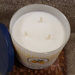 Bath & Body Works blue yellow FRESH AMALFI LEMON three (3) wick scented candle 411G / 14.5 OZ. Comes in a white yellow pinstripe jar with a blue lid.