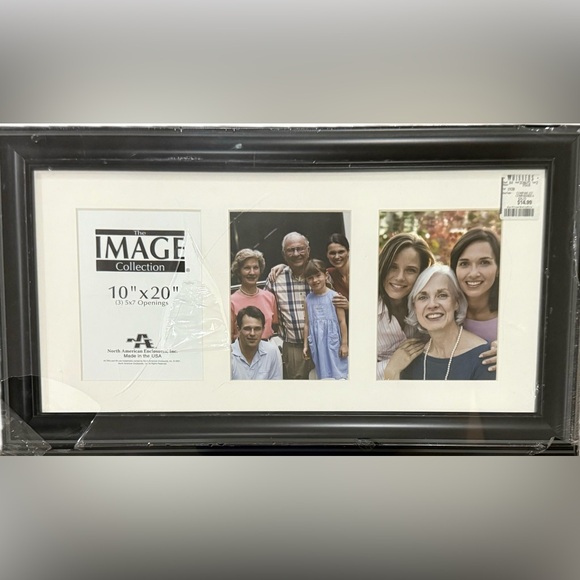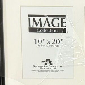 Beautifully display three photographs in this Image Collection collage frame. The black wall frame has a wood grain texture and an off white mat. Display three 5" x 7" photos or remove the mat for a 10" x 20" image. Hanging hardware is attached to the back. Made in the USA by North American Enclosures Inc.