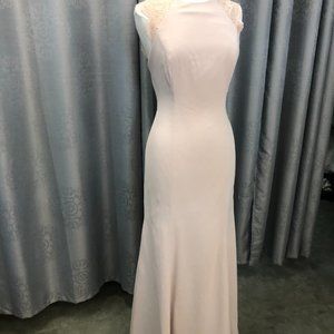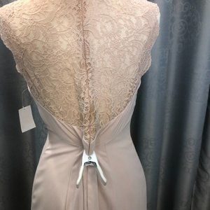 Beautiful Ballet Pink, Blush baby pink Bridesmaid dress or Mother of the Bride / Groom dress by Dessy in Crepe and Lace. It is beautifully tailored with an elegant neckline and gorgeous lace back detail/accents. This gown is absolutely stunning. Very elegant! :) The colour is called Cameo