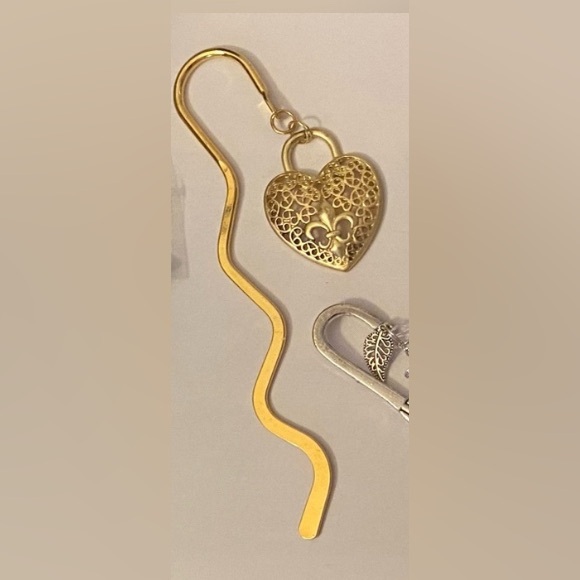 1. Gold plated bookmark with heart and an Aventurine gemstone amulet. This gold plated bookmark is 6" long.