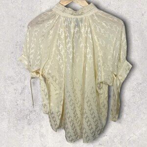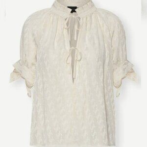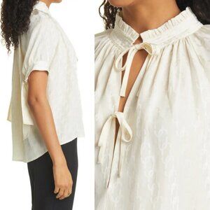 Brigitte Herskind Gajol Jacquard Tie Cuff Blouse in Vanilla Sun and Women's Size 40 EU (= US Size 8). Retails for $250 USD (approximately $348 CAD). From Nordstrom. A tonal textured jacquard and ruffle-trimmed collar detail this airily draped top styled with a cut-to-the-midriff split neck that sweetly spices up the look.