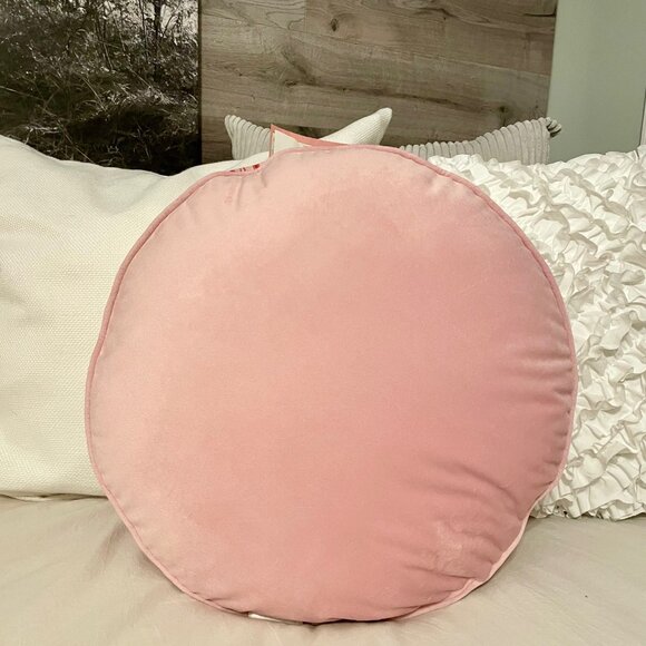 Get ready for Pinkmas with this stunning round pillow in lovely festive neutral, red, and pink tones. The front has an adorable gingerbread theme with gingerbread men and houses with candy canes all about. The sides are a cute candy cane stripe and the back is a velvet, soft pink. This pillow measures a 15.5" diameter.