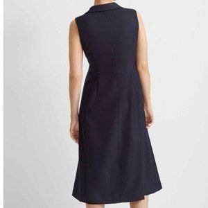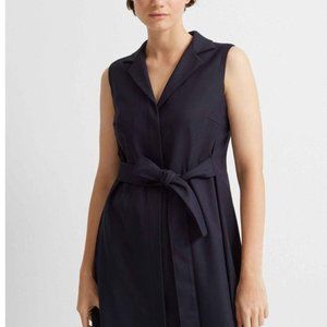 Notched lapel; concealed button front; self-tie belt at the front; center back seam.