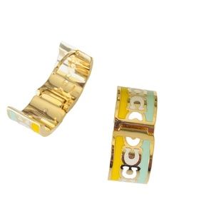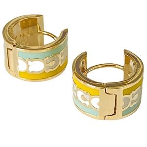 Goldtone hinged huggie hoop earrings with buttercup enamel framing the infinite row of grey Coach signature C's (the C’s look white in some photos - that’s from my editing program - they’re all grey in color).
