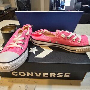 The NEW Converse Chuck Taylor All Star Shoreline Slip-On in Pink is a stylish and comfortable option for women in size 9. Featuring a low top design and lace-up closure, these sneakers offer a classic look with a modern twist. Made with a knit fabric upper and rubber outsole, these shoes are durable and versatile for everyday wear. The pink color adds a pop of fun to any outfit, making them a must-have for any fashion-forward woman.