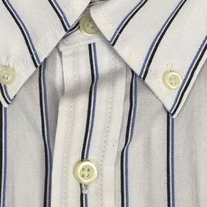 Men’s Size Medium. Cotton/Polyester Blend. White with two-tone blue stripes. Short sleeves. Button down collar. Patch pocket.