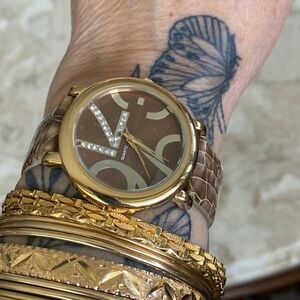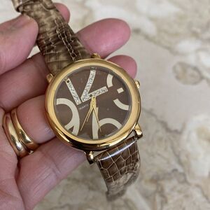 Brand new lovely quartz wristwatch in on-trend neutral tan colour, snakeskin embossed strap, with a round dial accented with gold tone stainless steel and crystal detailing.