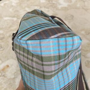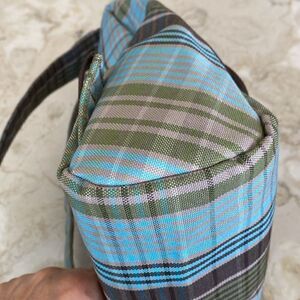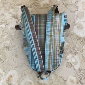 In new condition without tags, cute Dakine Cosmo mini backpack 6.5L size in lovely blue, green, brown plaid water repellent 600D polyester.