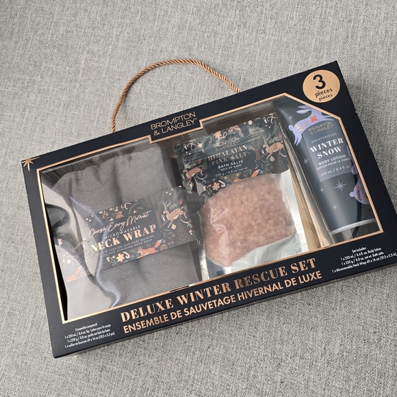Deluxe winter rescue set by Brompton & Langley. Includes neck wrap, bath salts, and body lotion. Perfect for winter relaxation.