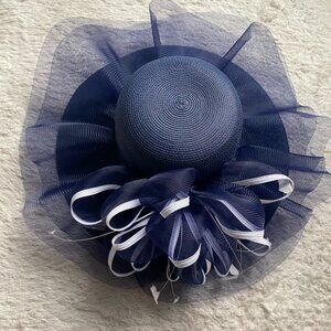 NEW Derby Hat Church Formal Dress Navy Royal Blue and White Feather Fascinator