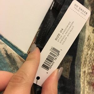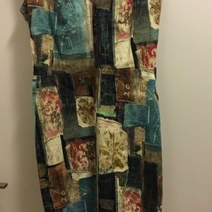 Multicolor Donna Karan midi dress with digital print throughout, V-neck, sleeveless, cutout accent at back and concealed zip closure. Belt included.