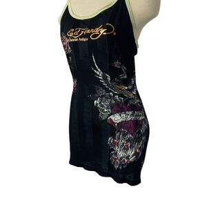 Authentic Ed Hardy by Christian Audigier racerback spaghetti strap tank dress / tunic. Black with green trim, signature “Love Kills Slowly” peacock and rose tattoo print, gold foil logo front and back. Super soft rayon.