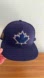 New Era Genuine Merchandise Toronto Blue Jays dark blue 100% wool fitted baseball cap. 59FIFTY style. Blue maple leaf on the front and brown side tag says “Toronto, Major League, Baseball, American League”. New Era logo on other side and MLB logo on back.