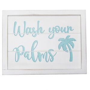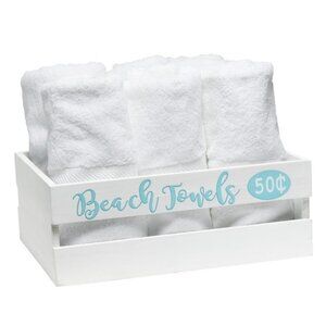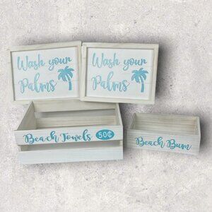 Elegant Designs Beach Wooden Boxes and Sign Pack. White wash finish on wood. Beach themed text and images in blue. Towel holder fits 8 standard bath towels and toilet paper holder fits 2 jumbo size rolls comfortable. Revamp your bathroom with this four piece matching decorative set. Includes 2 decorative frames, 1 toilet paper holder and 1 towel holder. Costal / beach design.