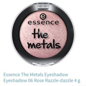 Essence The Metals eyeshadows deliver an intense metallic and chrome effect with a smooth, creamy texture that is highly blendable and long-lasting. These eyeshadows create a bold, eye-catching look similar to a wet-effect finish without being glitter-based, dry down without cracking, and are often available in a range of colors, including gold, rose gold, and deeper shades.