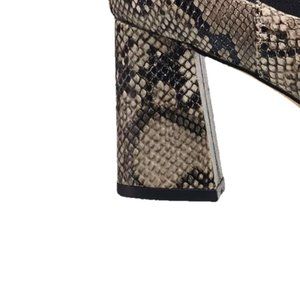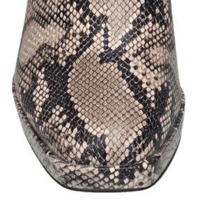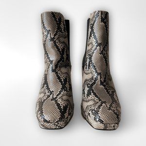 French Connection Penny Chelsea Block Heel Booties, Ankle Boots in soft truffle color and snake pattern with platform sole.