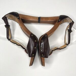 NEW WITHOUT TAGS Frye Dolly Jeweled T Strap wooden chunky heels. Bringing up back to 70s & 90s with the clunky wooden soles and heels. Such a fun artsy look! Leather upper. Clog like heels accented with exposed brushed gold metal studs. The strap up the foot has four large brooch-like jewels that are red, honey, rose gold and green colors. In excellent new condition with only a few marks to the soles from in-store try-ons. Please see photos for measurements and details. Women’s size 8.5.
