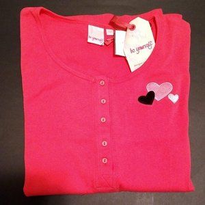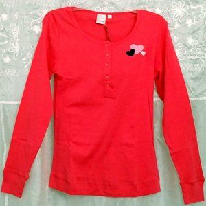 Long sleeve 100% cotton crew top with black, pink & silver embroidered hearts; 5 buttons.