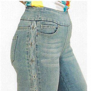 A pull-on ankle jean elevated with pretty embroidery and sequined details down the side for a little extra sparkle! Soft and finished with comfy stretch , this denim will keep you looking and feeling your best while providing all-day comfort.