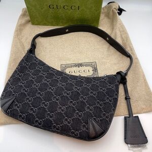NEW GUCCI Jacquard Black Denim GG Monogram silver Horsebit Shoulder Bag Black