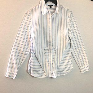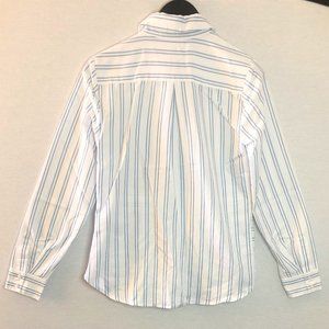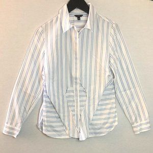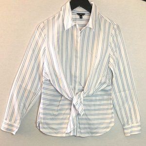 (NEW) GUESS White & Blue Striped Button Down Dress Shirt with Front Tie Detail; Can be worn done or undone; Never worn out, only tried on. Perfect for the office or or business casual wear!