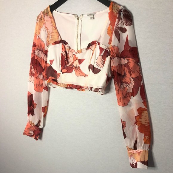 (NEW) GUESS White Floral Long Sleeve Crop Top with Bustier & Back Zipper Detail; Never worn, only tried on; gorgeous autumn print!