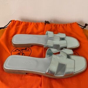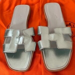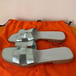 NEW HERMÈS SILVER-BLUE ORAN SANDALS