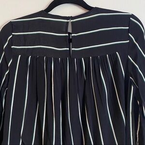 NWT H&M long sleeve crewneck black blouse with white & forest green stripes. Made from woven, crêped viscose fabric with a gathered yoke at back. Opening at back of neck with button, gently angled shoulders with decorative gathers, and long sleeves with narrow cuffs with button. Unlined.