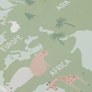 Description: Light green/white/dark green/black/beige/gray, Europe, Asia, Africa, Antartica, South America, North America, Patterned, Map, panda, whales, penguins, rhino, bear, flamingo