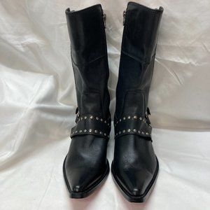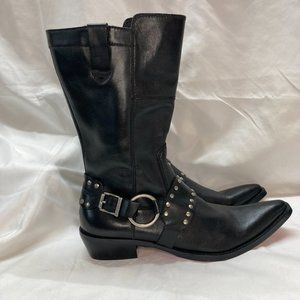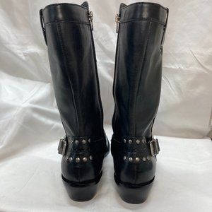 NEW Harley Davidson Low Heel Mid Calf Moto Western Leather Boots Size 8 Black. These boots have a full inside zip closure, harness with buckle, 1 1/2" heel and 12" total boot height and a 14” circum. mid calf. These boots would make great riding, party or concert boots!