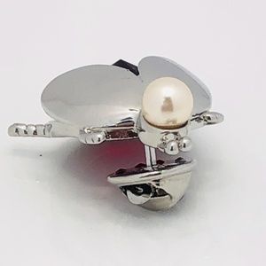Brand new Henri Bendel beetle pin in silver with a ruby glass body.